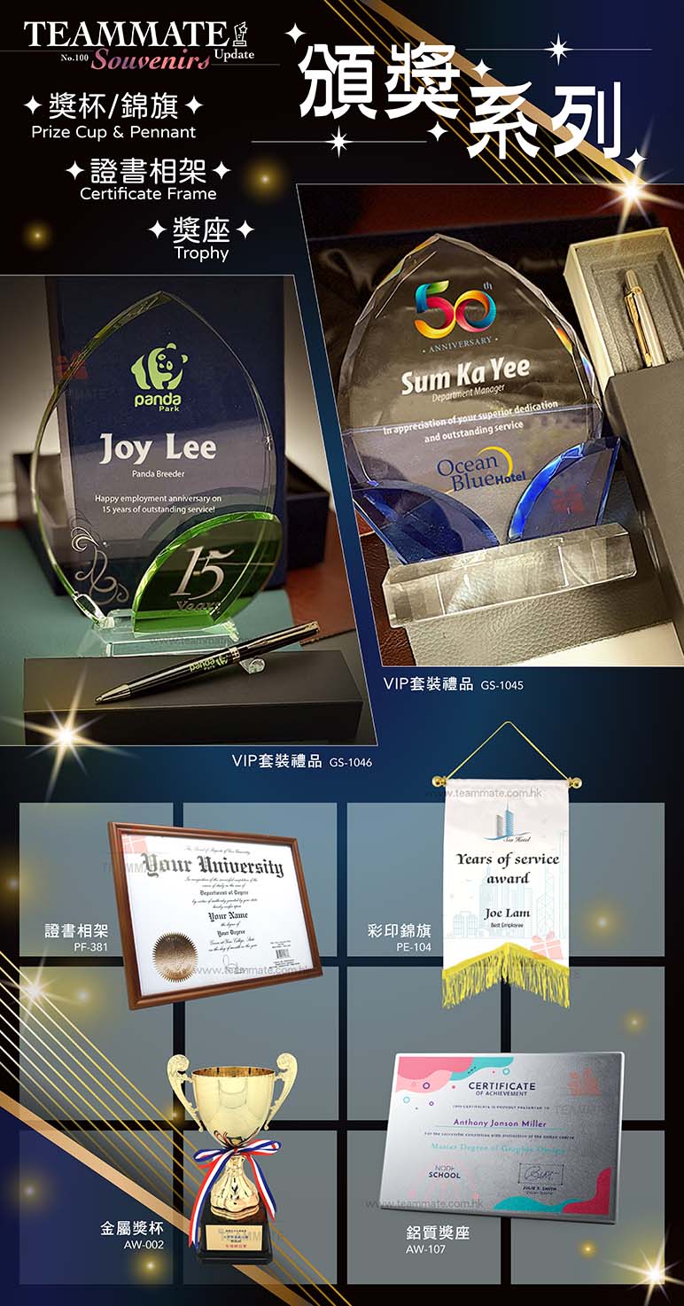 學校、公司或機構每年均舉辦競賽、典禮及周年慶祝活動,透過頒獎表彰成就及嘉許參與者,令活動更具儀式感與意義。選擇合適的獎品如證書、錦旗、獎牌或水晶獎座,需要有質量與服務的公司像我們 Teammate HK Ltd.