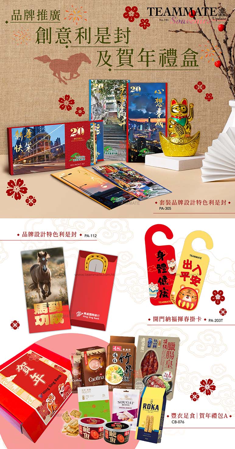Teammate 提供多款 2026 農曆新年禮品,包括 CNY 賀年禮籃(如發財好市果籃、高級食品禮盒)、訂造利是封、揮春 及 商務禮品包。所有產品均可 企業訂製,加入公司 Logo,打造專屬的 公司送禮 方案。