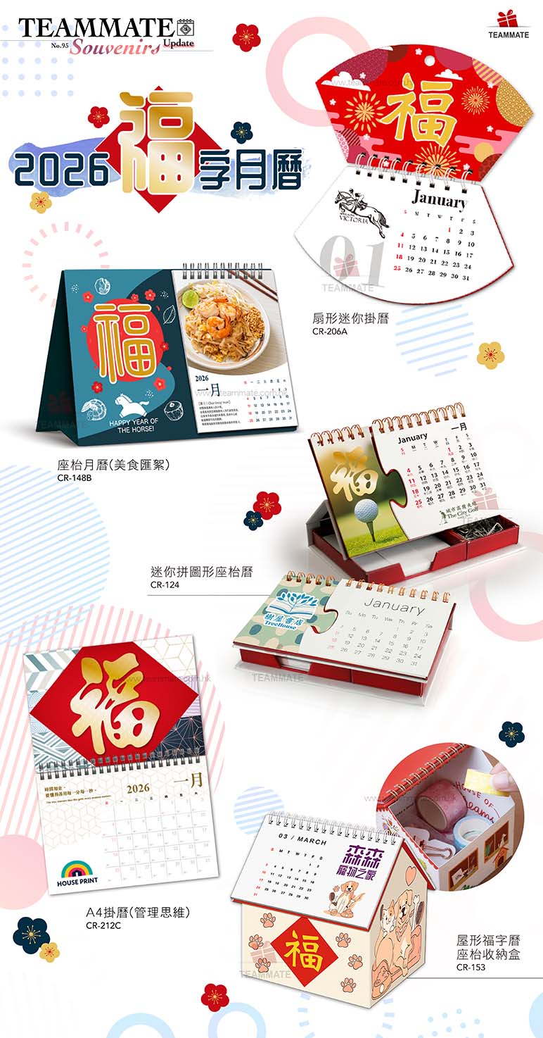 Teammate has designed a series of "Fook Calendars" (福字月曆) that are both auspicious and filled with blessings. These traditional calendars incorporate innovative ideas, merging ancient cultural elements with modern design to create a unique collection of corporate calendars.