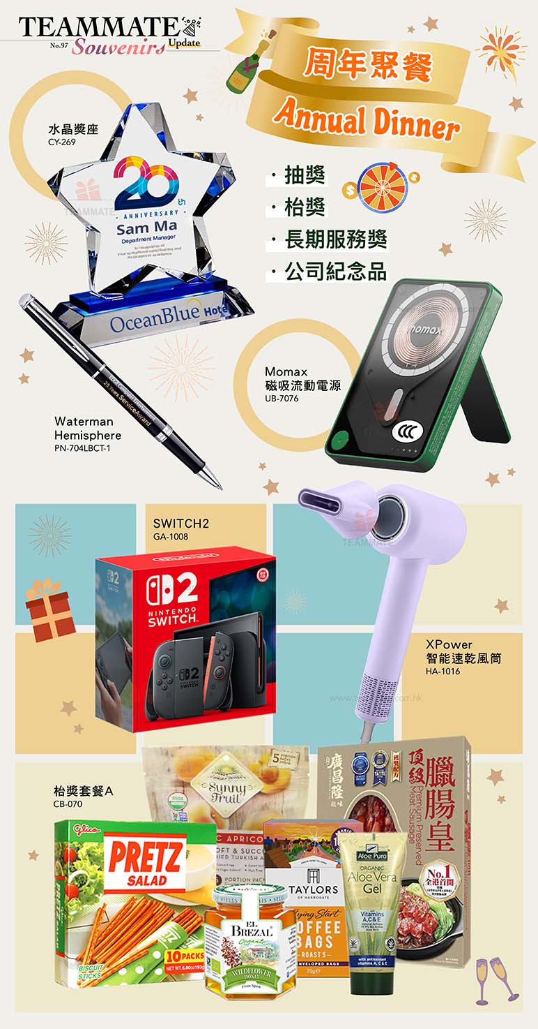 Annual Dinner 年度聚餐,令人期待的時刻!所以令到負責籌備嘅同事又開心又傷腦筋。今期我哋系列特別準備不同產品,為公司機構提供一系列Annual Dinner 所需用的禮品及禮物。有新奇刺激又有睇頭適合大抽獎嘅禮物、每人都有份嘅枱獎禮物、仲有頒發員工長期服務獎及表現優秀獎,一系列豐富而且吸引嘅獎品及禮物,令你眼前一亮。