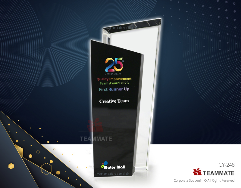 答:TEAMMATE 提供 3D 內雕、噴砂刻字及 UV 全彩印刷水晶獎座,款式包括鑽石形、山峰形、盾牌形等,適合金融、保險、教育及政府機構頒獎禮使用。建議排版次序:公司標誌 → 獎項名稱 → 得獎者姓名 → 日期。